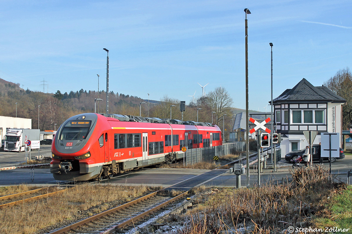 Das von einer Versicherungsagentur renovierte, ehemalige Stellwerk "Bw" am Bahnübergang Ruhrstraße in Bestwig lässt sich mit etwas Geschick trotz der vielen Masten und Schilder auch von der Bundesstraße 7 aus fotografisch umsetzen. Am Vormittag des 21.01.2026 legte dort 633 117 als RE 10718 nach Hagen gerade ab.