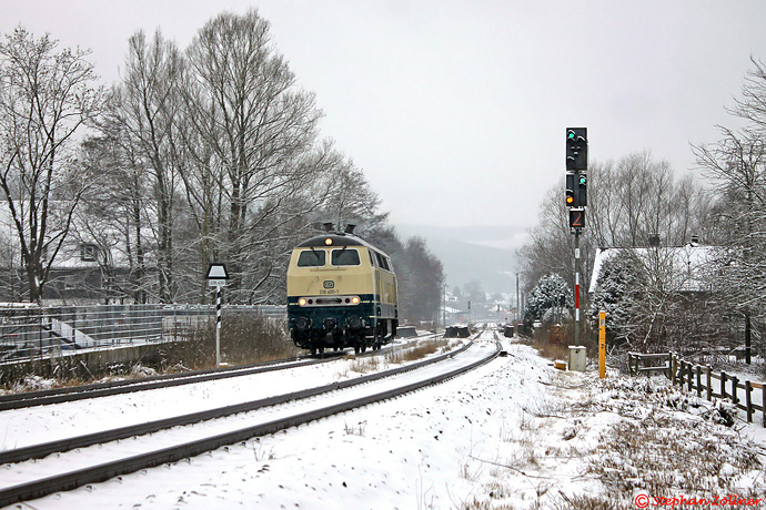 Bei echtem Sauerlandwetter konnte am Mittag des 26. Januar 2026 die 218 490 der Fa. Railsystems RP im Oberen Ruhrtal gesichtet werden. Nach einem Tankstopp in Bestwig fuhr die Lok weiter in Richtung Osten. Dabei wurde der RE 10760 von Winterberg am Abzw. Nuttlar wegen der Kreuzung ausgebremst. Die weitere Fahrstraße gen Bahnsteig in Bestwig war dabei bereits eingelaufen, wie das Signalbild am Esig F zeigt.