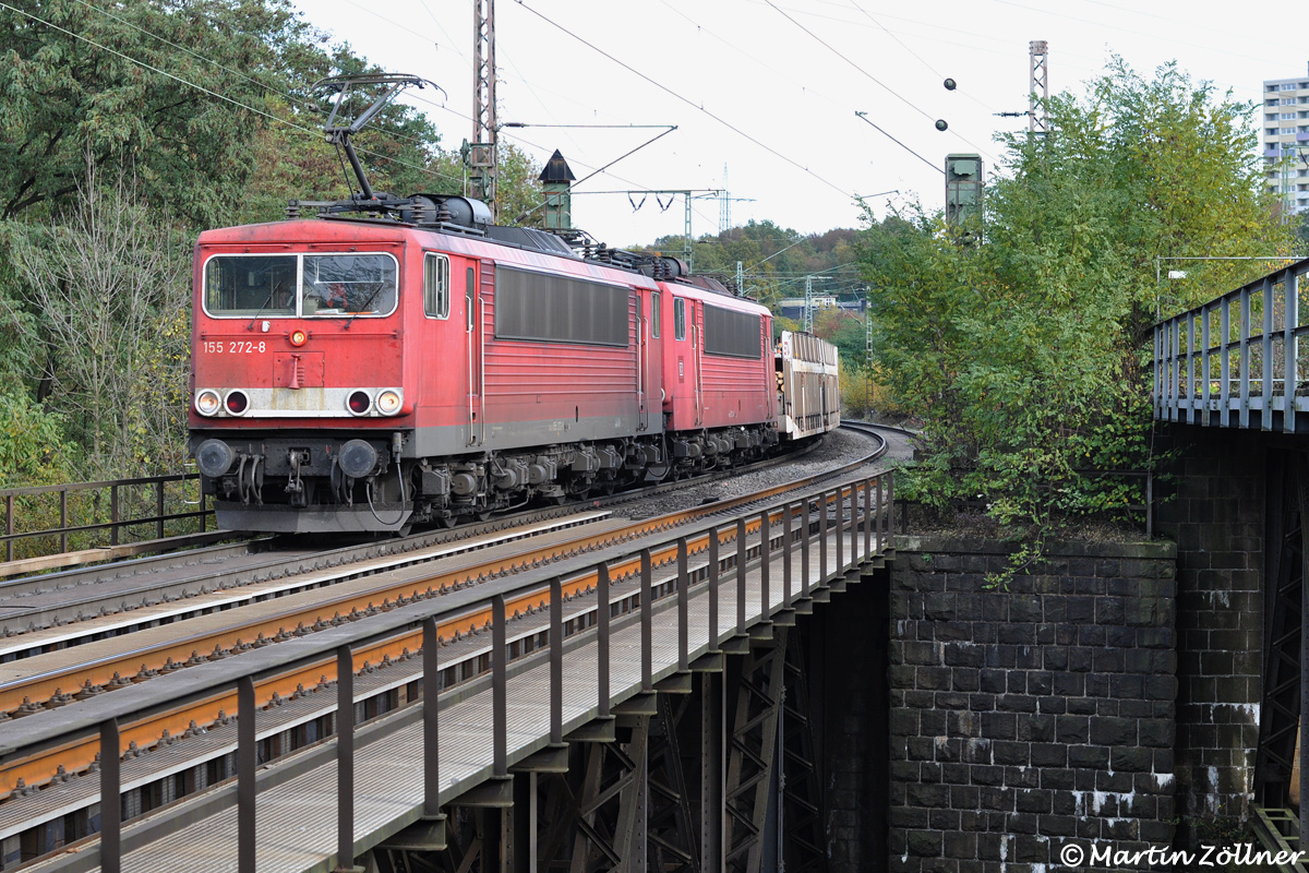 Beim Warten auf den Brammenleerzug von Hohenlimburg konnte auch dieser Mischzug von Seelze nach Vorhalle als Beifang abgelichtet werden. Leider lief die zur der Zeit vorletzte orientrote 155 214 an zweiter Stelle hinter 155 272. Die Volmebrücke verbindet dabei die Hagener Stadtteile Hengstey und Vorhalle.