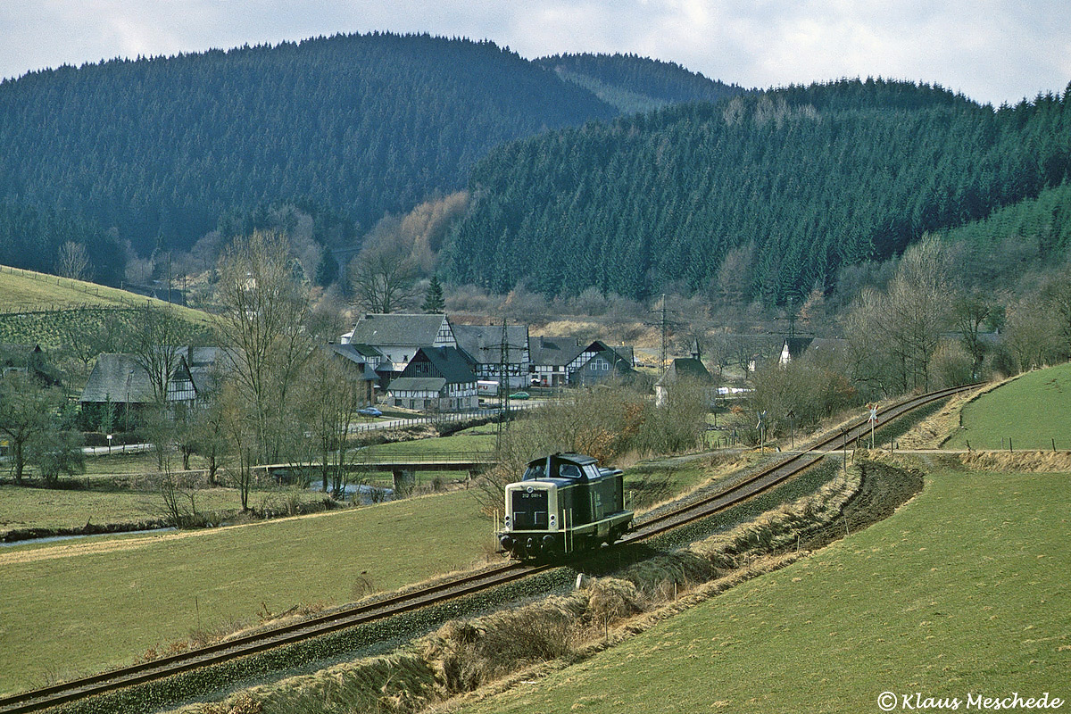 Im März 1985 konnte auch Klaus Meschede eine der eher seltenen Bedienfahrten nach Eslohe mit der Kamera festhalten. 212 081 hatte nur einen einzelnen G-Wagen am Endpunkt abzuholen und war deshalb bei Sallinghausen auch nur als Lz unterwegs.