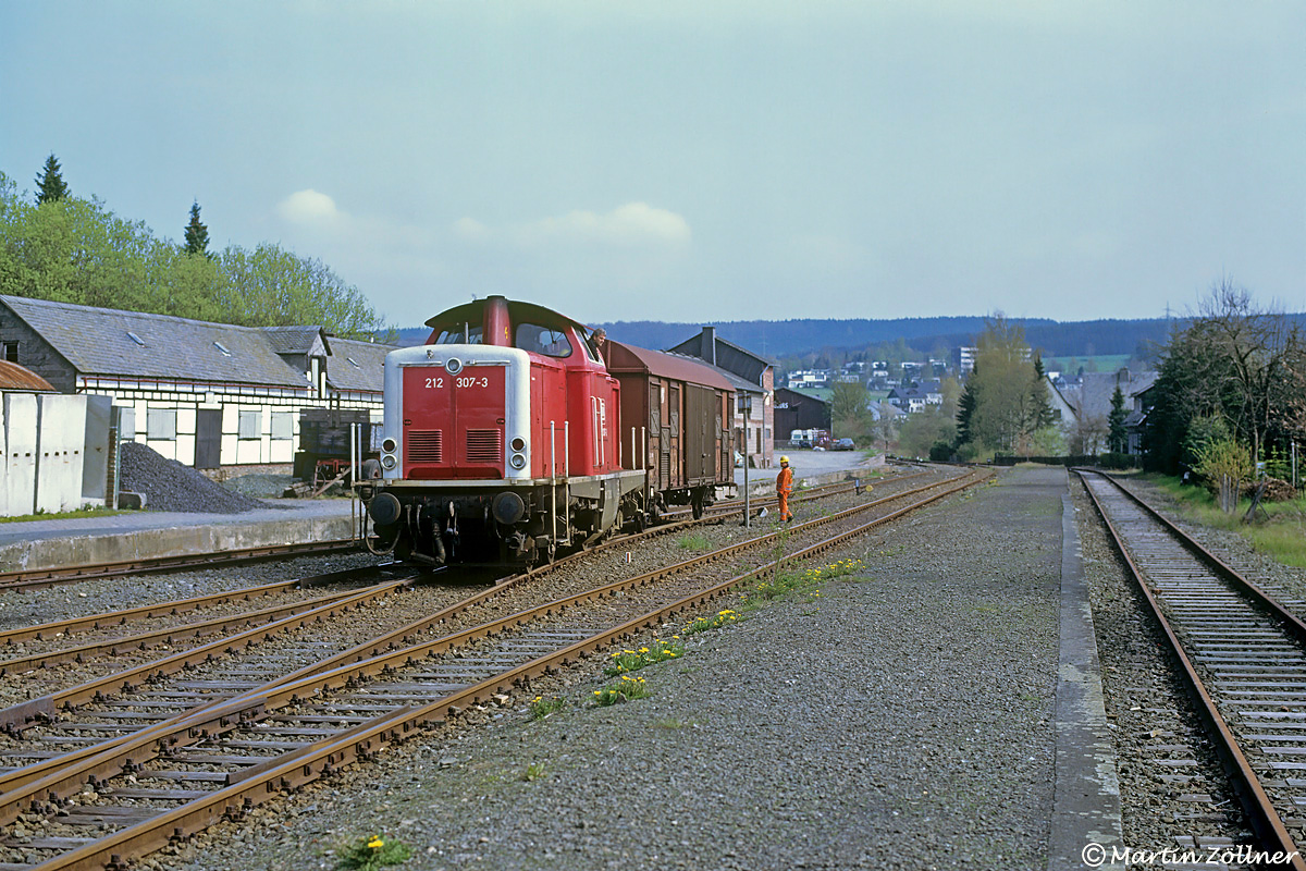 Am 08. Mai 1991 ist 212 307 gerade mit einem Kartoffelwagen aus Bestwig in Schmallenberg eingetroffen. Nach dem Umsetzen wird der Gbs sogleich am Schuppen für die Fa. Gnacke zur Entladung bereitgestellt. Danach kehrt die Lok als Lz nach Bestwig zurück.
