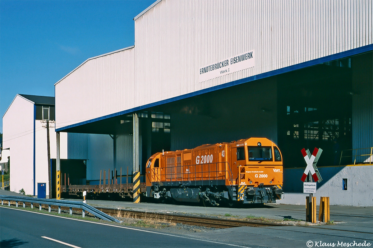 Die Güterbedienung von Erndtebrück samt Anschlussstellen übernahm die Siegener Kreisbahn Anfang 2003 im Auftrag von der DB. So konnte Klaus Meschede im Mai des Jahres Lok 43 auch bei der Abholung von drei leeren Kbs-Wagen im Anschluss 1 der Eisenwerke ablichten, wie hier zu sehen.