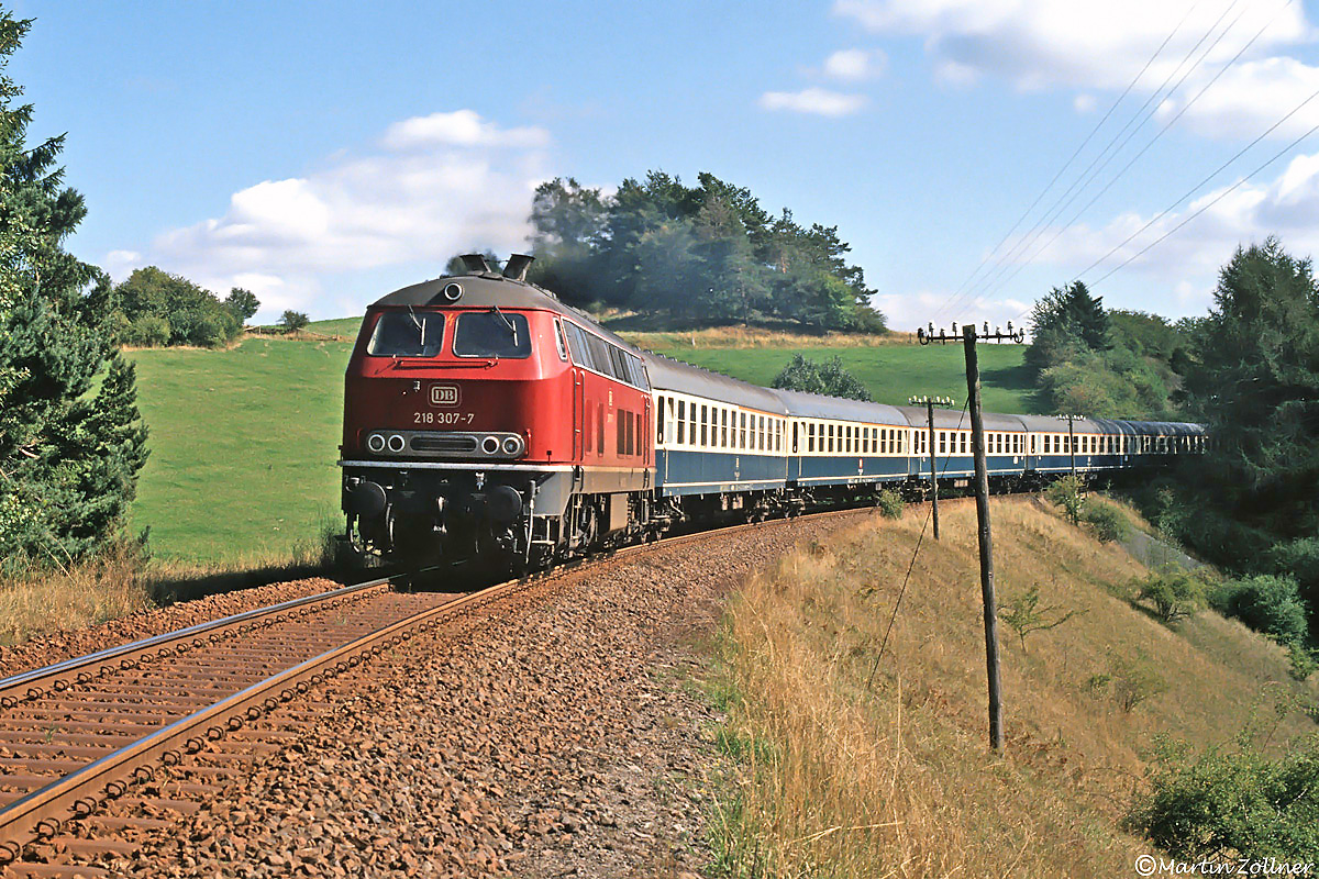 Bei Eimelrod kommt am Sonntag, den 16. September 1990 die Regensburger Leihlok 218 307 mit dem Leerzug Lr 37328 aus der Wochenendabstellung in Korbach nach Willingen über den hohen Damm. Ab dort bildet sie mit dem überwiegend erstklassigen Schnellzugwagenmaterial den Entlastungszug D 10328 nach Oberhausen im Blockabstand vor dem ebenfalls leihlokbespannten D 2328 Korbach – Amsterdam.