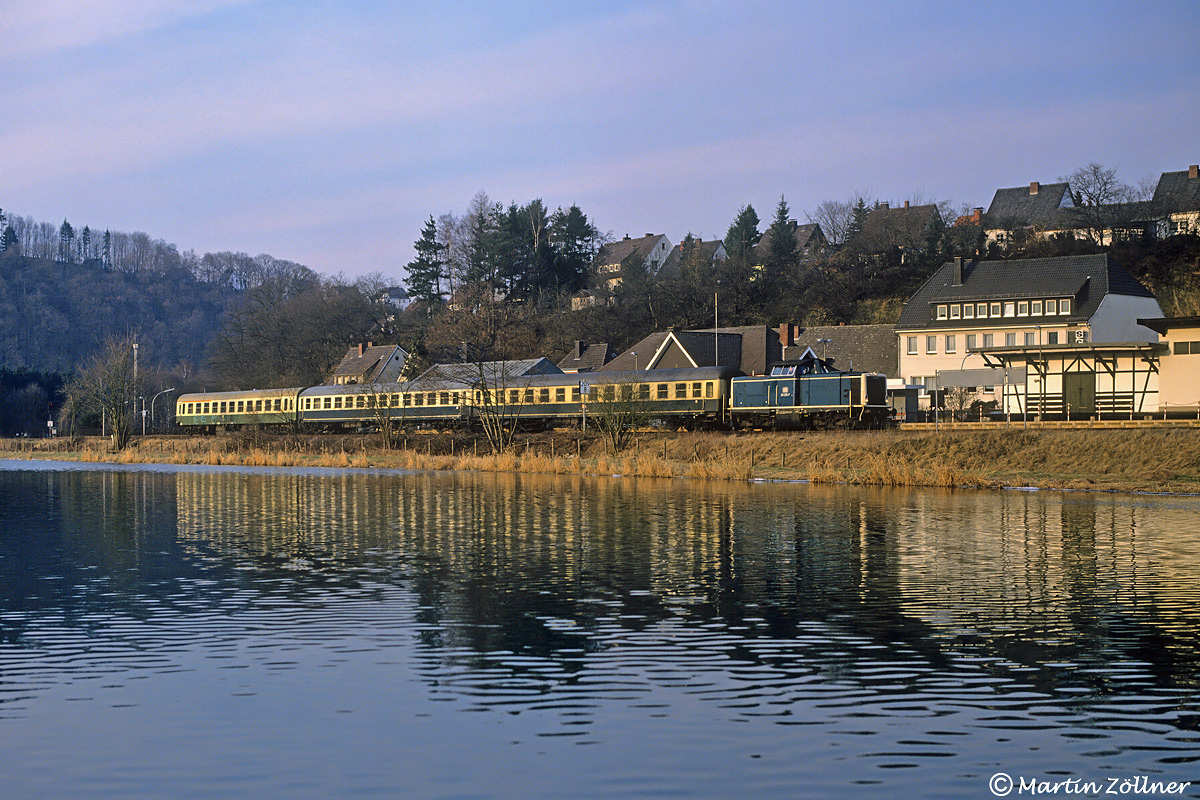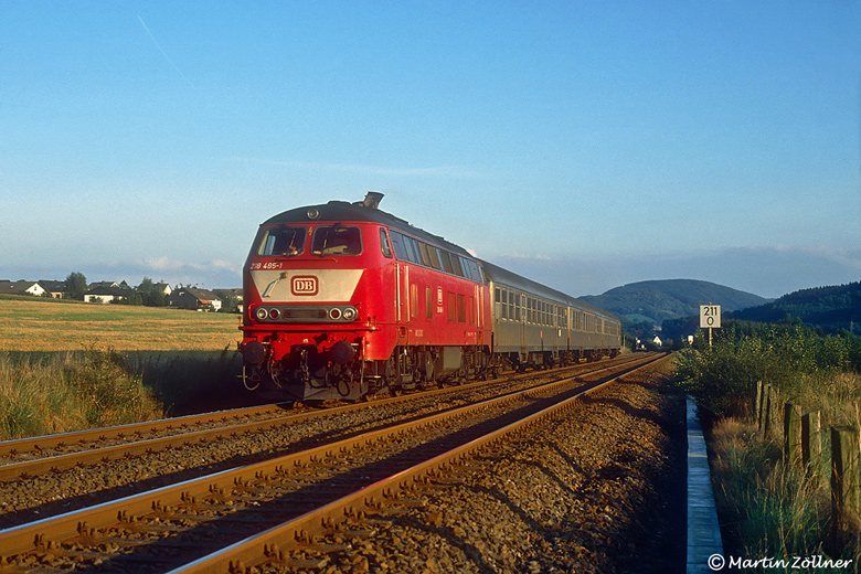 Im September 1990 war von der querenden Trasse der Autobahn 46 in den Bockumer Ruhrwiesen noch nichts zu sehen. Im allerletzten Abendlicht des 13. konnte Martin die vom Bw Lübeck ausgeliehene 218 485 mit dem E 3694 von Winterberg nach Duisburg Hbf in der klaren Luft auf dem Diafilm bildlich ablegen.
