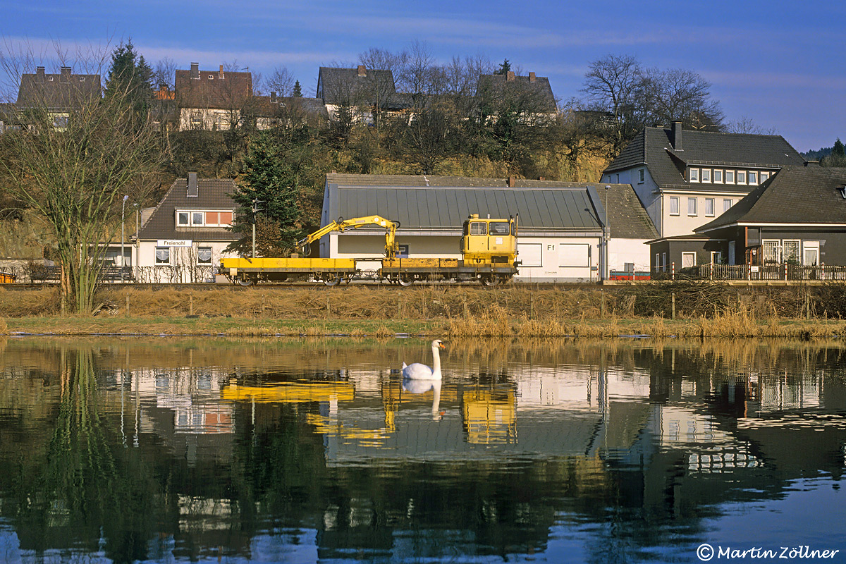 Mitte der 1990er Jahre war der Bewuchs in Freienohl an der aufgestauten Ruhr noch nicht so heftig. Am Nachmittag des 19. Februar 1994 wurde vorgemeldet, dass wegen Mangel an Lokomotiven der Baureihe 218 der E 3469 von Essen nach Bestwig mit der 211 278 durchs Obere Ruhrtal gefahren werden sollte.