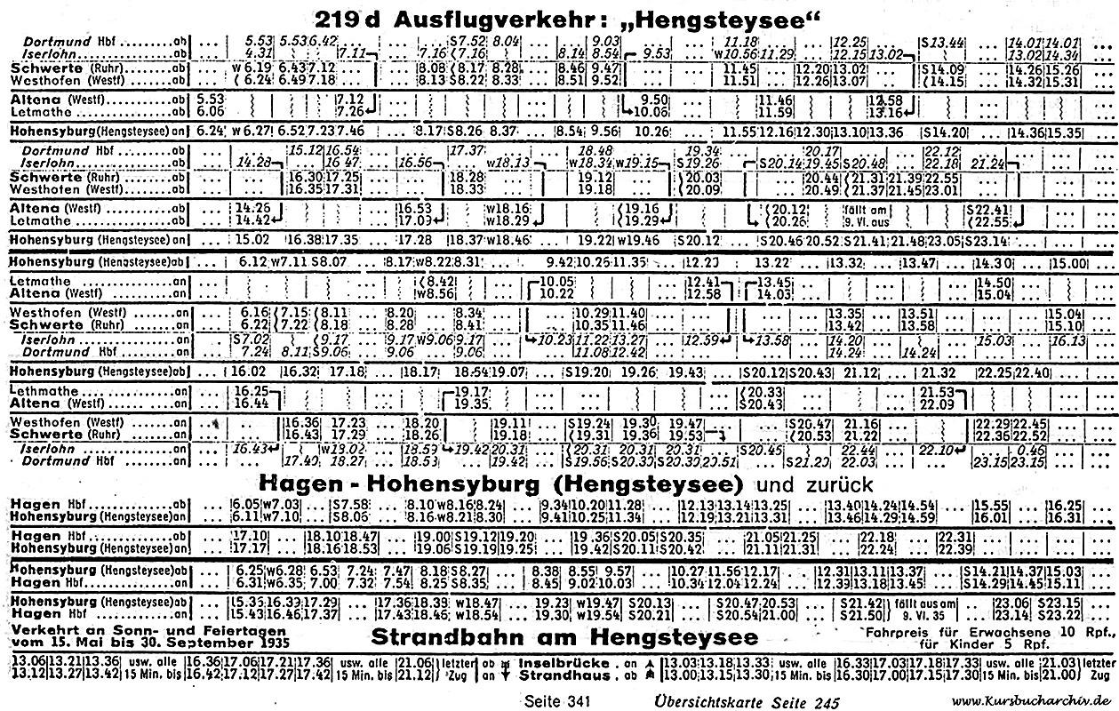 Gefahren wurde ja nur jeweils im Sommerfahrplan und das in der Zeit vom 15. Mai bis 30. September des Jahres an Sonn- und Feiertagen im Fünfzehnminutentakt in der Zeit von 13.00 Uhr bis 21.00 Uhr. Im Sommerkursbuch 1935 waren dazu noch umfangreich die Anschlusszüge aus Hagen, Schwerte und von der Ruhr-Siegstrecke bis Hohensyburg direkt einsehbar gelistet, wie dieser Auszug zeigt: