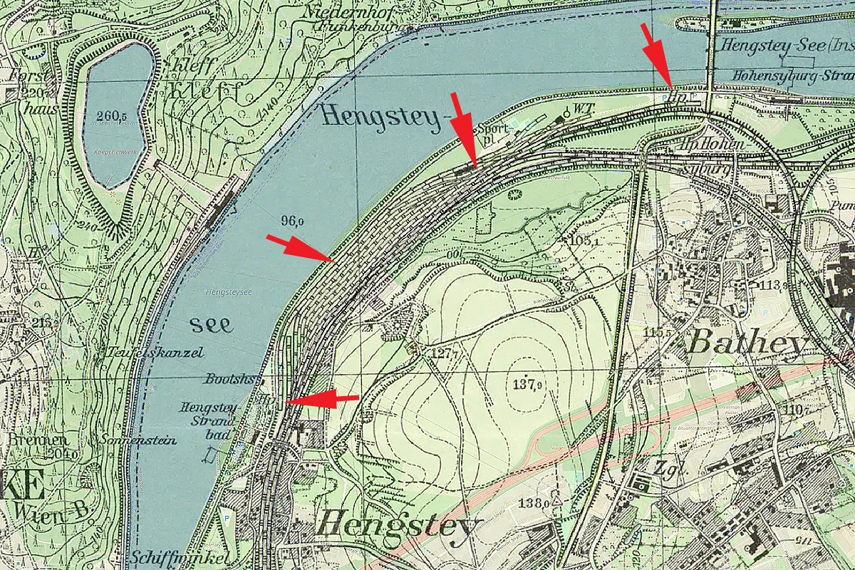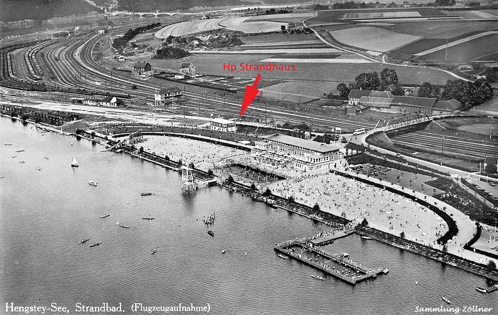 km 2,0 Hp Strandhaus HengsteyseeIm Mittelpunkt dieser Aufnahme sehen wir das repräsentative Strandhaus mit Freibad am Hengsteysee im Jahr 1932. Links davon hinter dem kleineren Gebäude befand sich der Bahnsteig des dortigen Haltepunktes der Strandbahn, wo die Züge von der Inselbrücke endeten. In der Vergrößerung ist die Stelle per Pfeil markiert.
