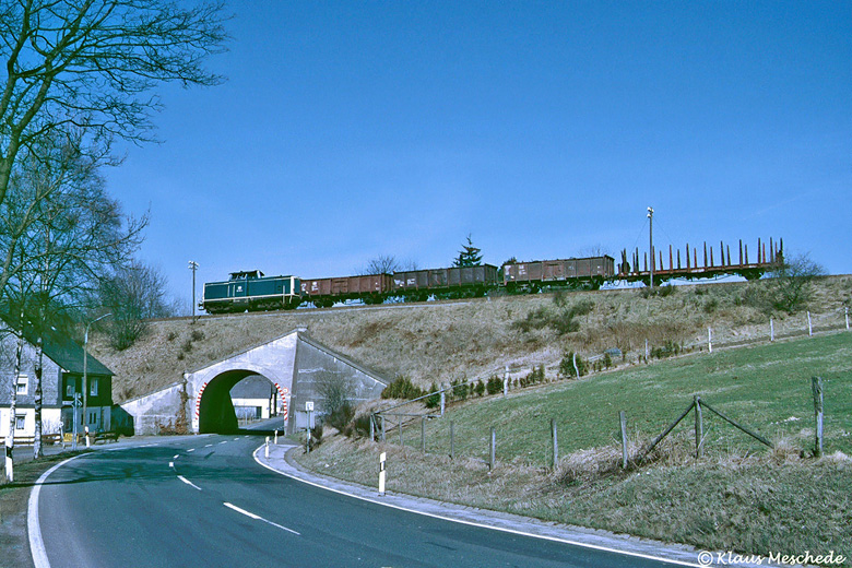 Km 45,1 BermershausenDer Winterfahrplan 1984 ⁄ 85 war der letzte, in dem der Streckenabschnitt Erndtebrück – Laasphe im Güterverkehr von Erndtebrück aus bedient wurde. Klaus Meschede verfolgte die Siegener 212 161 mit ihrem einen Wagen als Üg 69531 an einem sonnigen Dezembertag 1984 und fertigte unter anderem dieses Bild bei der Durchfahrt in Bermershausen an. Schon ab 02. Juni 1985 wurde nur noch als Sperrfahrt bis Oberndorf und wieder zurück gefahren.