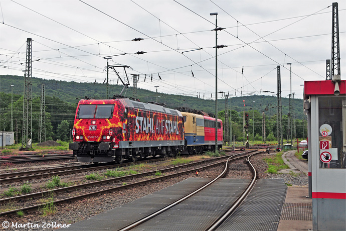 Am Nachmittag des 03. Juni 2024 werden 185 077 und die besonders lackierte 151 129 vom Museumsfest in Koblenz-Lützel nach Hagen-Vorhalle überführt. Von der Einfahrgruppe am Abzweig Schönfeld rollen die beiden besonderen Exemplare am Stellwerk Vwf vorbei in die Lokabstellgruppe.