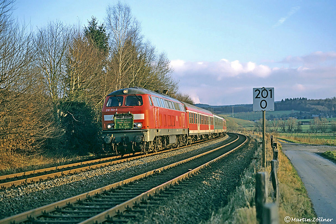 Am 10. Dezember 2006 hieß es im Oberen Ruhrtal endgültig Abschied vom planmäßigen Einsatz der Baureihe 218 nehmen. Bei Uentrop bespannte 218 153 letztmalig den Sonntagsverstärker RE 29232 von Willingen nach Hagen, Aufnahme im letzten Abendlicht. Das Letzte-Fahrt-Schild verkündete "Letzte Fahrt, BR 218, Oberes Ruhrtal, RE 29232, 10.12.2006"
