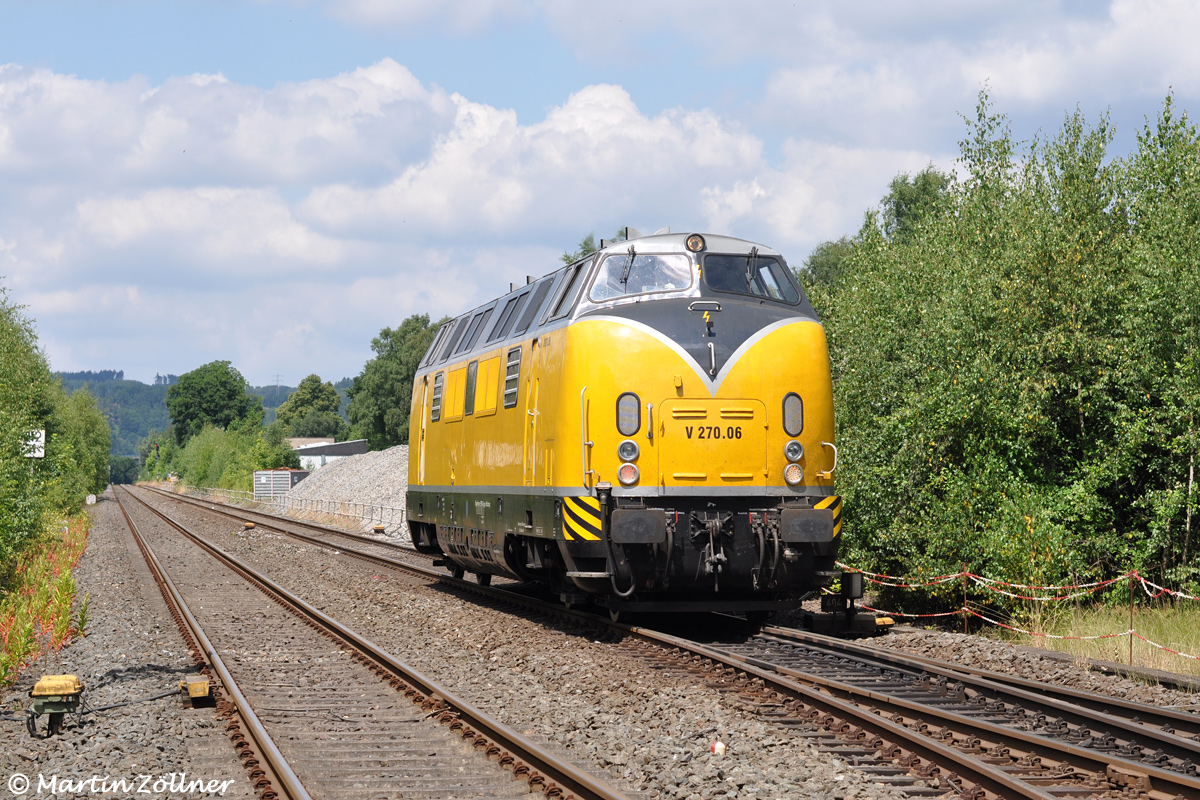 In den Sommerferien 2009 fanden im Oberen Ruhrtal unter Vollsperrung zwischen Arnsberg und Meschede Gleiserneuerungsarbeiten statt. Am Samstag, den 04. Juli 2009 hat die Griechenlandrückkehrerin 221 106 alias EBW V270.06 an der Bettungsreinigungsmaschine Dienst und rollt nachmittags zum Auffüllen der Kraftstoffvorräte in den Bahnhof Wennemen, wo sich der Basisstützpunkt der Gleisbaufirma befindet.