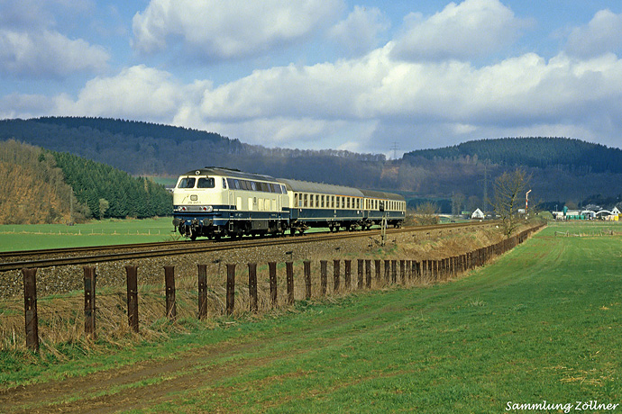 Krimiwetter gab es am 11. April 1985 im Sauerland. Am kreativen Stahlschwellenzaun in Bockum ließ sich genau in einer Wolkenlücke die Kasseler 216 207 mit dem kurzen, nur aus zwei Wagen der Gattung ABm gebildeten E 3685 von Duisburg nach Brilon Wald blicken, als der Kameraverschluss passend ausgelöst wurde.