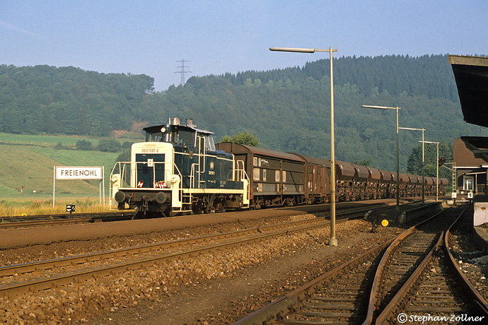 Am sonnigen Morgen des 24. August 1988 wurde mal wieder der Übergabe nach Schmallenberg mit der Kamera aufgelauert. Eine erste Aufnahme entstand bei der Durchfahrt in Freienohl, wo zu dieser Zeit noch beide Gleise neben der Ladestraße bis vor den Güterschuppen vorhanden und so bei Bedarf ein Umsetzen der Lok gleich hier möglich war.