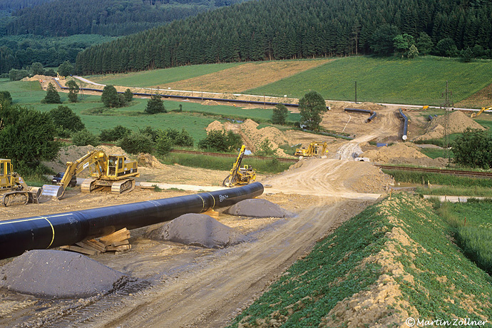Der Bau der 180 Kilometer langen Ruhrgasleitung L 56 von Werne an der Lippe nach Vitzeroda (Thüringen) führte die Rohrverleger im Sommer 1993 auch nach Sallinghausen. Die Aufnahme zeigt die Verlegearbeiten mit Querung der Strecke 2861, die –obwohl ja bereits ein Jahr betrieblich gesperrt (Stichwort: Baggerkollision Wennebrücke)– nach Abschluss der Arbeiten natürlich ordnungsgemäß wiederhergestellt wurde. Leider zwecklos, der Betrieb nach Eslohe wurde nie wieder aufgenommen.