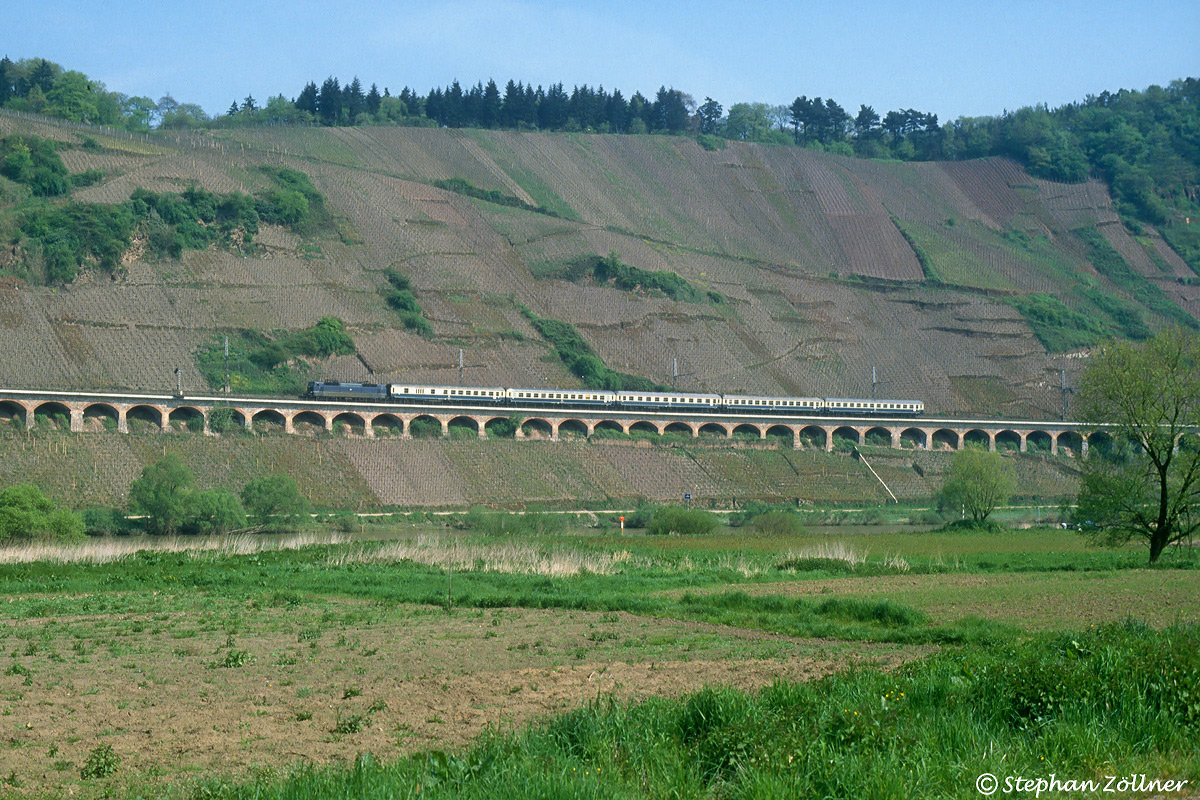 Der Maifeiertag 1989 wurde bei sonnigem Wetter fototechnisch an der Mosel verbracht. Auf der Moselstrecke verkehrten damals noch die hochwertigen Schnellzüge mit den Zweisystem-Lokomotiven der BR 181.2, wie der D 2152 von Koblenz nach Saarbrücken. Gegen 11.00 Uhr überquerte dieser gen Wittlich fahrend den Pündericher Hangviadukt mit einer unbekannten blauen Lok.