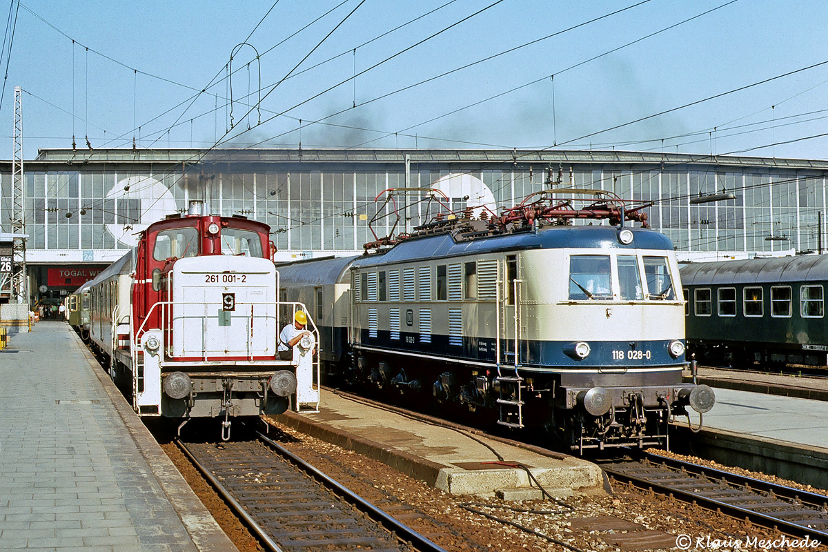 Gleich zwei DB-Oldtimer in seltener Lackierung erwischte Klaus Meschede am Abend des 10. Juni 1976 nebeneinander im Münchener Hbf. Links zieht die mit besonderem Warnanstrich versehene Vorserienlok 261 001 gerade in Gleis 26 einen Gepäckwagen ab und rechts nebenan steht 118 028 mit einem Schnellzug abfahrbereit. Wohl noch im gleichen Jahr wird die V 60 in o ⁄ b umlackiert, während die 118 den Farbwechsel in dieses Schema bereits elf Monate hinter sich hat.