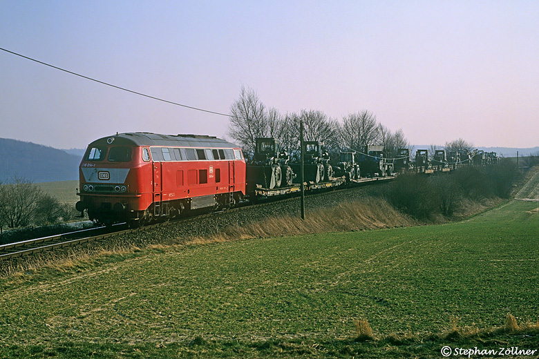 Der Streckenabschnitt Unna Industriepark – Fröndenberg wies in den neunziger Jahren planmäßig keinen Güterverkehr auf. Sehr selten verkehrten hier Umleiterzüge oder Sonderleistungen. Am 21. Februar 1994 wurde über diese Linie ein Militärtransport mit Lademaßüberschreitung abgewickelt. Die Oberhausener 216 014 zog den Dgmv 91226 von Hemer nach Unna, befördert wurden diverse Radfahrzeuge, Radlader und Raupen. Die reichlich bemessene Fahrzeit nutzte der Handradbediener an der einzig dafür möglichen Stelle bei Kessebüren für einen kurzen Fotohalt zur Anfertigung dieser Aufnahme. Leider fand die Fahrt zur besten Gegenlichtzeit statt.