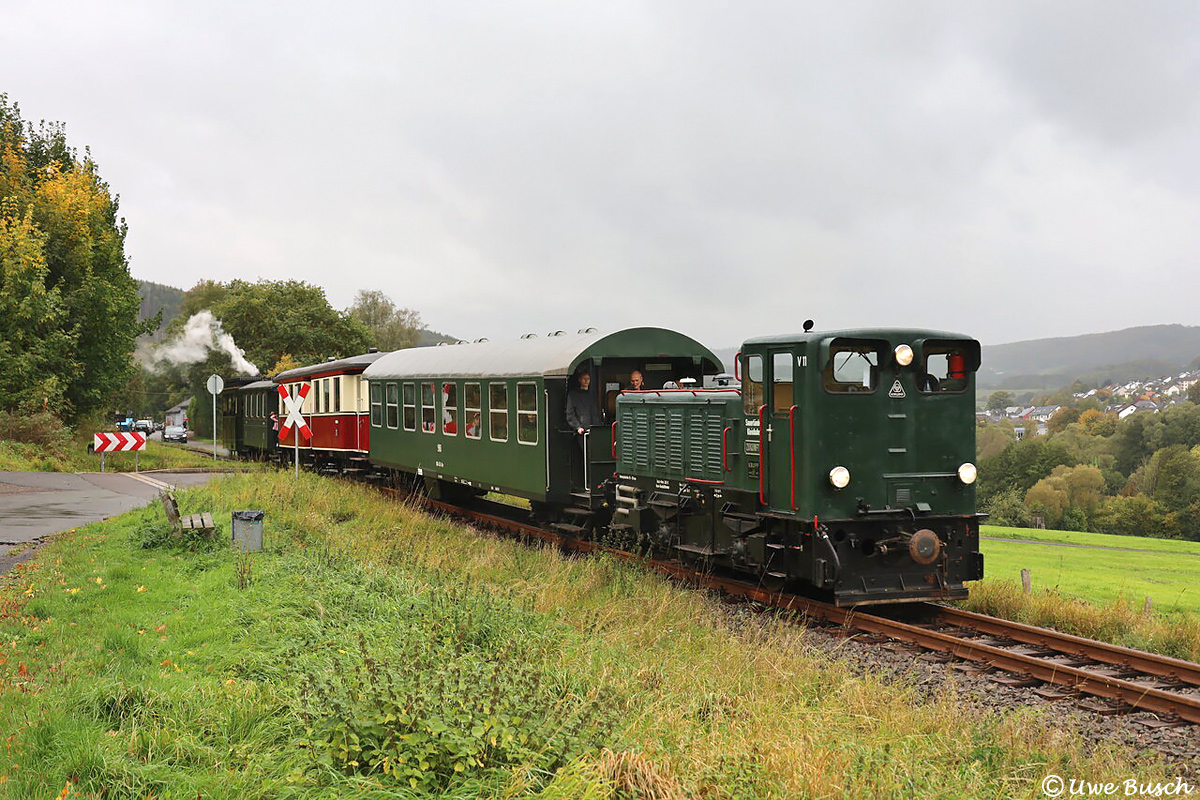 Am 05. Oktober 2025 herrschte auch im Elsetal typisches Sauerländer Mistherbstwetter. Bei der Museumskleinbahn war an diesem Tag die Kastendampflok "Rur" im Einsatz. Zusammen mit der Diesellok "Zukunft" bespannte sie die Züge zwischen Hüinghausen und dem Köbbinghauser Hammer. Uwe Busch stand am Bahnübergang in Hüinghausen und lichtete die Vorbeifahrt des Gespanns bei der Talfahrt in Richtung Köbbinghausen ab.