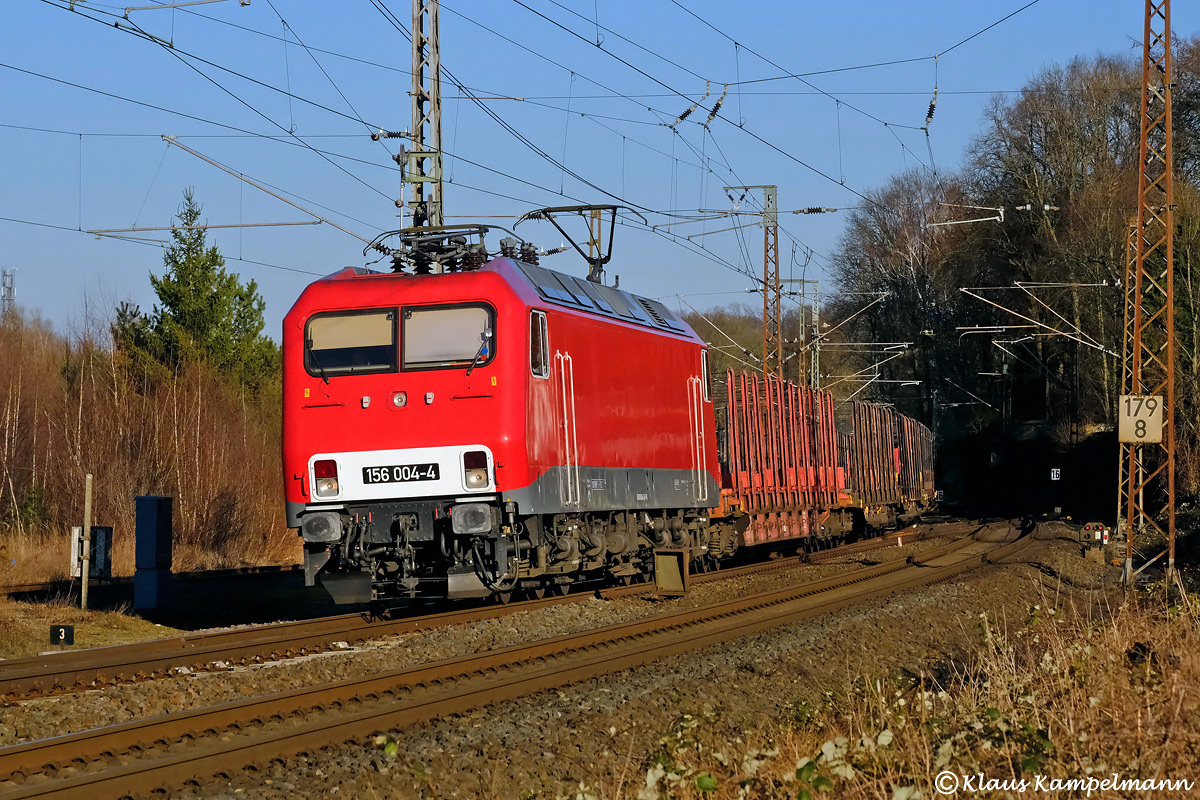 Nachdem im Mai 2020 das Fahrzeugwerk Karsdorf, eine 100%ige Tochter der Erfurter Bahnservice GmbH (EBS), die 156 002 übernommen hatte, folgten ihr im Januar 2022 die drei anderen 156er. Am 08.03.2022, der Zug war schon lange vor Erreichen der ersten Soester Weichen zu hören, war die Überraschung groß, als 156 004 im makellosen Lack mit dem aus leeren Rungenwagen bestehenden DGS 69483 aus Göttingen nach Düsseldorf-Eller am Fotografen vorbeieilte.