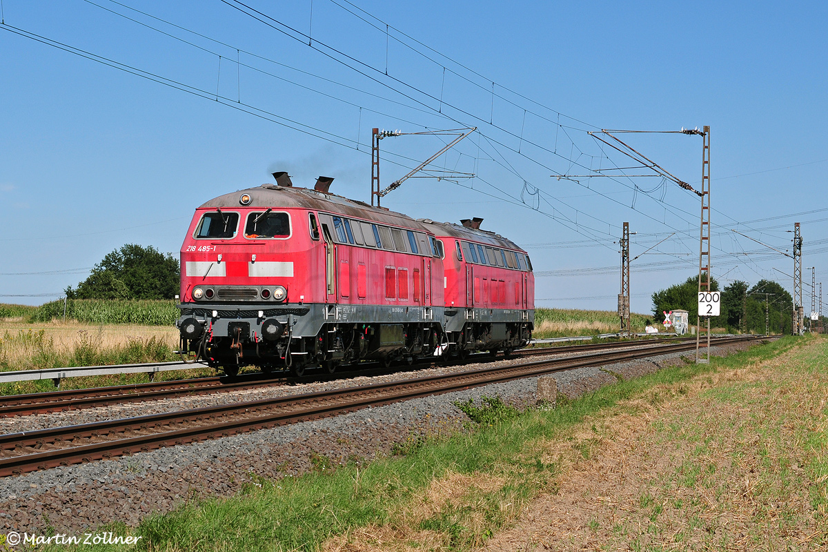 Der 31. Juli 2020 brachte sehr heißes, sonniges Wetter mit sich. Bei 30°C musste bei Holtum glücklicherweise nicht lange auf die Loküberführung von AIX Rail aus Kassel zum Stammsitz nach Aachen Rothe Erde gewartet werden. An der dortigen Feldweganrufschranke eilt das Doppel von der frisch untersuchten 218 485 angeführt Richtung Unna vorüber. 218 457 lies sich derweil schleppen, nachdem sie zuvor schon eine Loküberführung von Kiel nach Kassel erledigte.