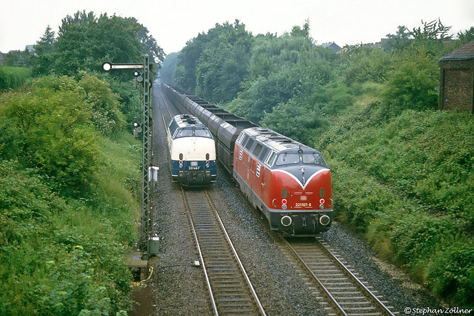 1983 bis 1987 wurde von den Ruhrgebietszechen Abraummaterial zum Bau der Emslandautobahn verwendet. Die sogenannten bis zu 2800 to schweren Waschbergezüge mit 221-Sandwich fuhren dabei die Bahnhöfe Legden, Gescher und Ahaus an. Am 18.07.1984 hatten 221 141 vorne und Schubse 221 107 hinten soeben den 57421 von Westerholt durch den Abzweig Zweckel von Gladbeck West aus hochgewuchtet, als sie am dortigen Bksig C der 221 140 begegnen, die Lz nach Wanne möchte.