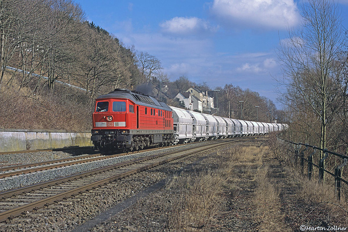 Mit einer Fuhre Kalk am Haken beschleunigt die Oberhausener 232 579 am 28. Februar 2003 in der Fröndenberger Bahnhofsausfahrt, um den Brocken von Horlecke ins Ruhrgebiet nach Oberhausen West zu befördern. Die Sonderleistung ersetzte an diesem Tag den sonst im Rheinkalkwerk Rhodenhaus geladenen Regelzug.