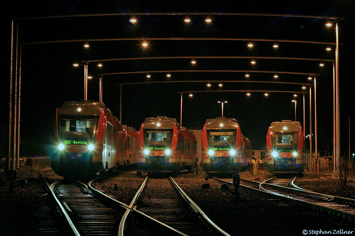 Ein Drittel des Dortmunder 648.1-Bestandes übernachtet planmäßig in Bestwig. Nach Ankunft des "Lumpensammlers" RE 29535 aus Dortmund um 0.44 Uhr und Versorgung mit Betriebsstoffen gesellt er sich zu seinen Brüdern in die Abstellanlage. Fürs Foto schnell aufgerüstet, warten in der Nacht von Rosenmontag auf Faschingsdienstag 2008 nicht weniger als sieben LINT auf ihren Einsatz am Morgen.