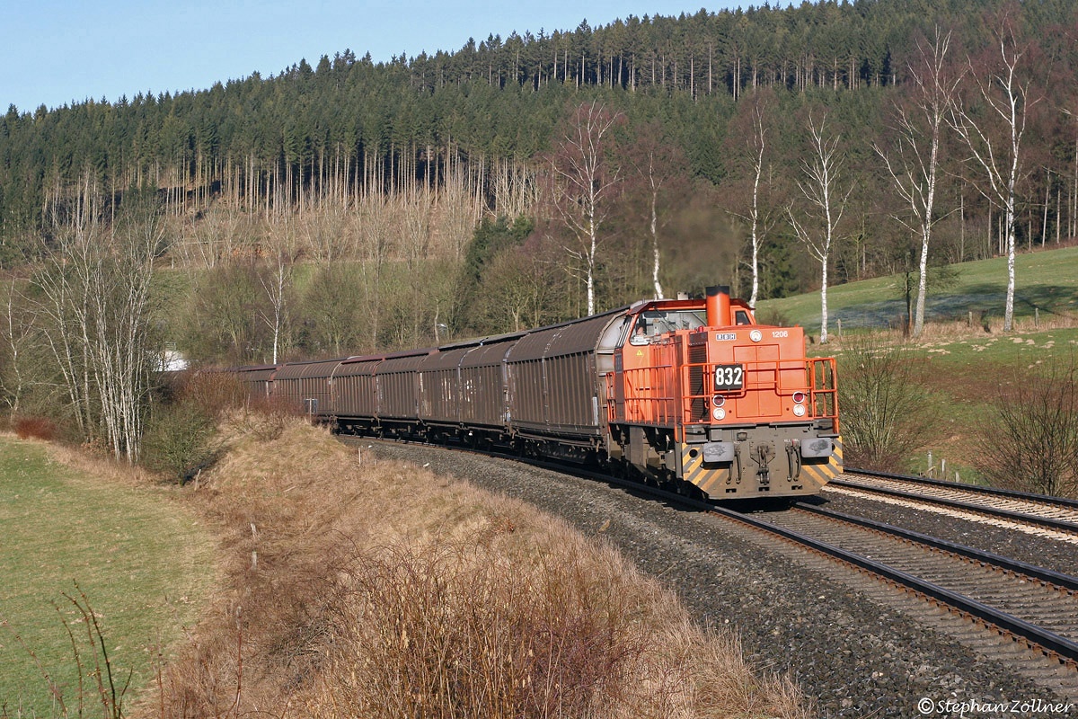Von den bei Railion eingesetzten G 1206 war die RBH 832 im Zeitraum September 2006 bis Januar 2009 am längsten im Sauerland anzutreffen. Am sonnigen 11. Februar 2008 konnte zum Beispiel diese Aufnahme vom Eggerzug am Olsberger Gierskopp angefertigt werden.