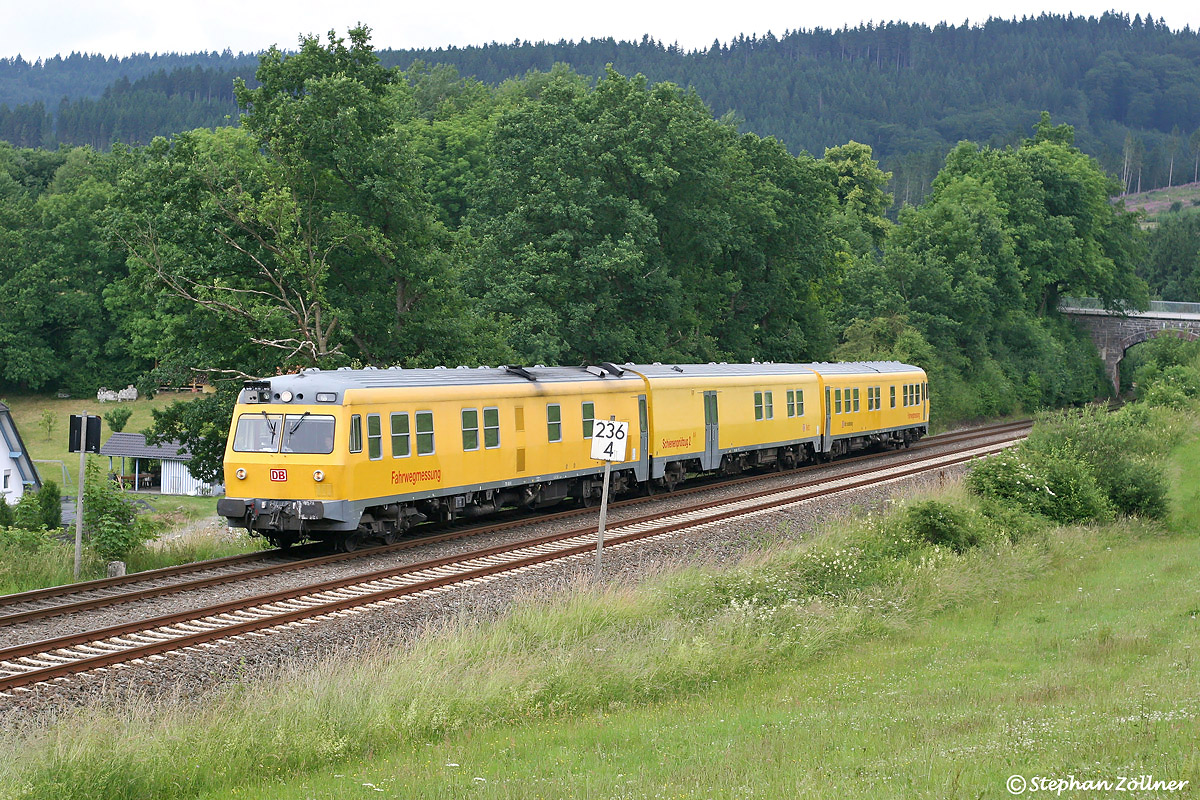 Am Nachmittag des 25. Juni 2008 gab sich mal wieder der Schienenprüfzug 2 im Sauerland die Ehre, um den Streckenabschnitt Marsberg – Warburg zu untersuchen. Mit gut 30 Minuten plus gelang dieses Bild bei Olsberg. Die geplante Rückfahrt zur Abstellung in Hagen Hbf entfiel wegen einer Weichenstörung in Scherfede komplett, weshalb es an diesem Tag auch bei dieser einen Aufnahme blieb.