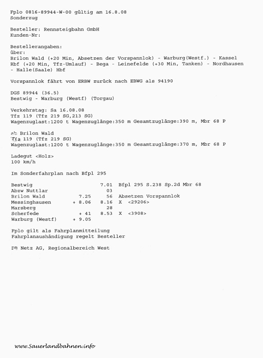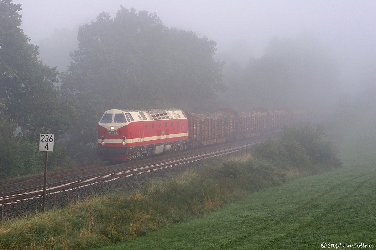 Im Sauerländer Frühnebel ist die von der Rennsteigbahn angemietete DB-Museumslok 119 158 am 16. August 2008 mit dem DGS 89944 von Bestwig aus auf dem Weg nach Torgau. Die Rote Brücke bei Olsberg, die man auf diesem Bild nur erahnen kann, hat sie gerade unterquert. Nach Absetzen der Schiebelok 213 339 in Brilon Wald geht es dann weiter an die Elbe.