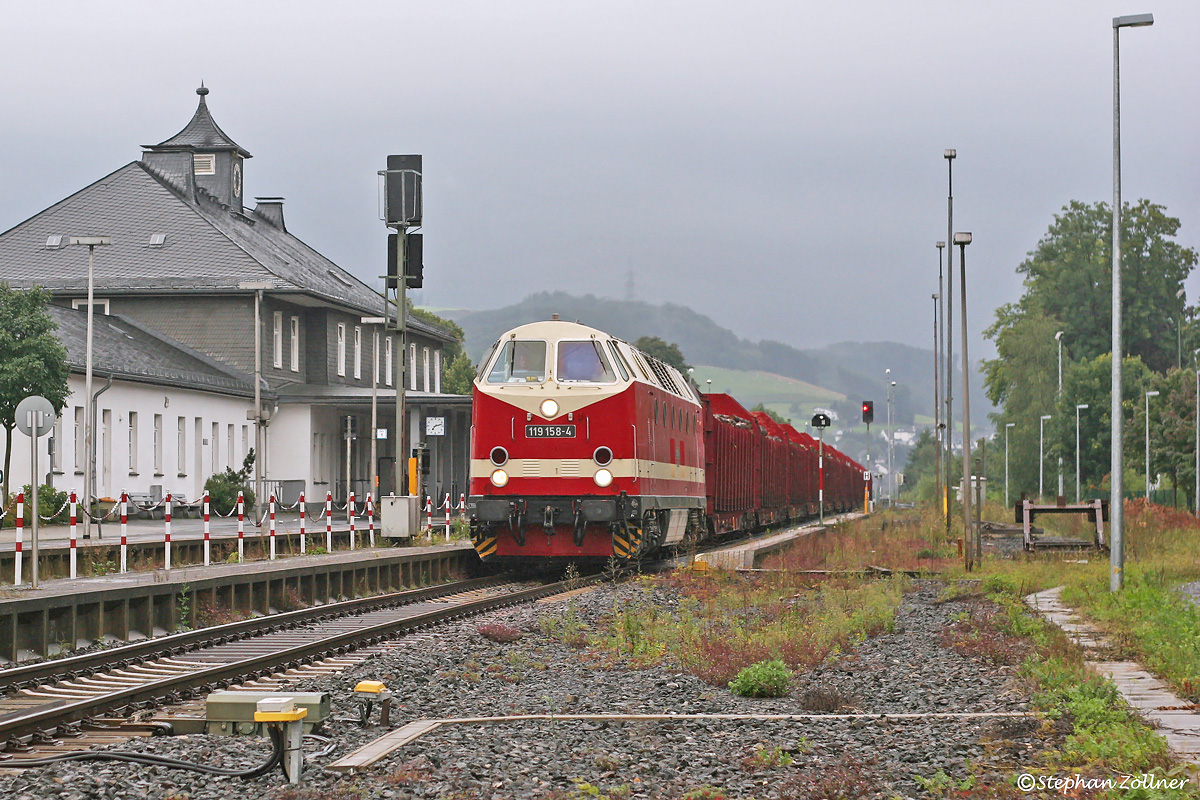 Ein großer Anteil bei der Bewältigung der Holzabfuhr nach dem Sturm Kyrill lag bei der thüringischen Rennsteigbahn, die zu diesem Zweck die ehemalige DB-213 339 in Bestwig stationierte. Die Lastgrenze war dabei mit zehn Vierachsern erreicht. Um mehr Fracht pro Fahrt befördern zu können wurde schließlich des U-Boot 119 158 des DB Museums angemietet, welches erstmals in der 33. KW 2008 an der Ruhr gesichtet werden konnte. Hier am 23.08 bei der Einfahrt nach Bestwig abgepasst.