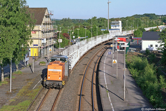 Nur der frühe Vogel fängt den Wurm. So konnte am 18. Mai 2009 um zwanzig nach Sieben in Fröndenberg dieser leere Sturmholzzug nach Arnsberg –traktioniert durch die BEG 202 271– in der Morgensonne vom Straßenüberwurf aus abgefangen werden. Beachtenswert auch die artrein gebildete Zuggarnitur, welche für die SETG im Einsatz ist.