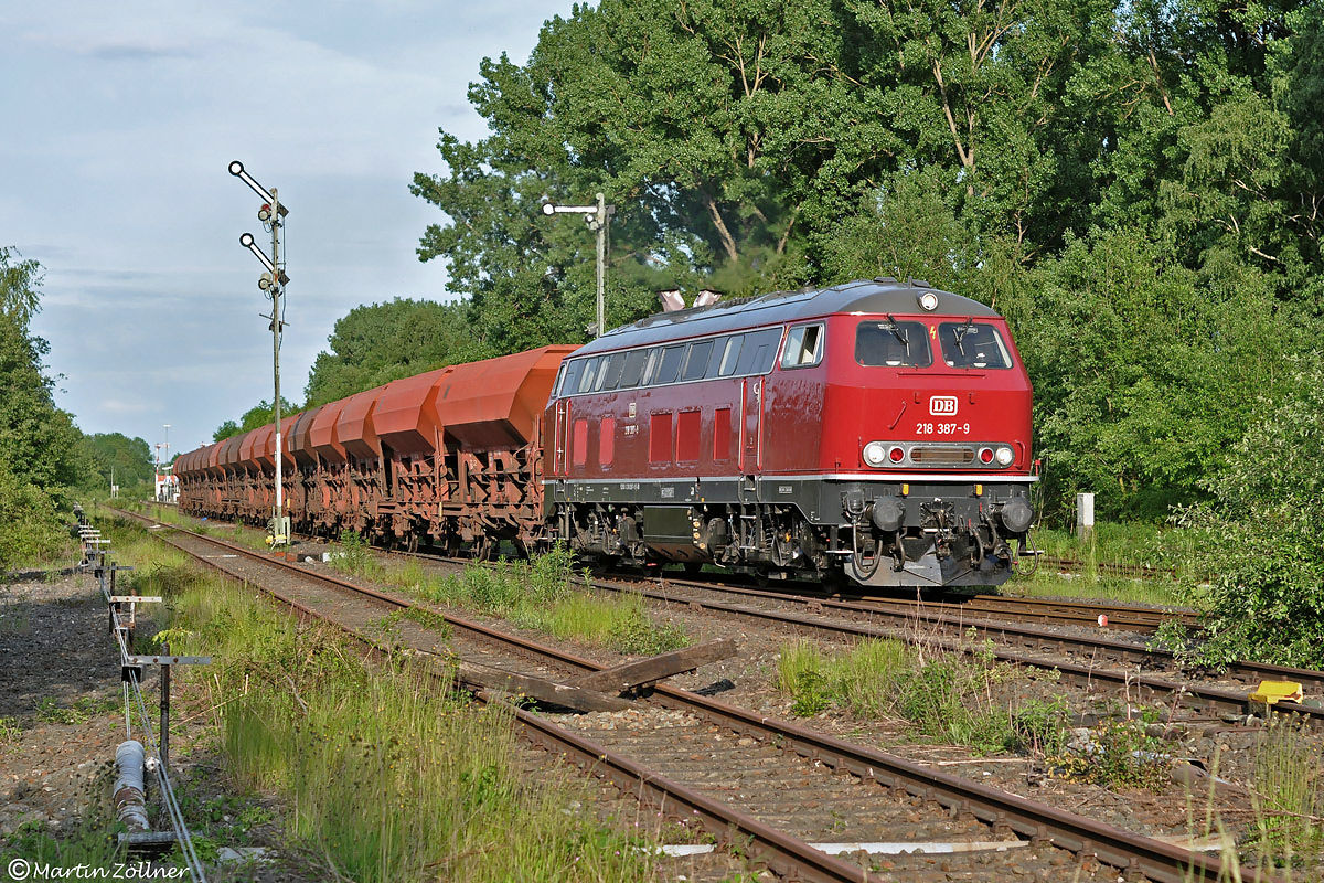Mit Revisionsdatum vom 20. März 2008 ließ die Kurhessenbahn die 218 387 im Werk Bremen hauptuntersuchen und mit altroter Farbe versehen. Ein Jahr später, am 19. Mai 2009 beförderte sie einen Schotterzug von Kassel Rbf nach Brilon Wald und konnte bei der Ausfahrt aus Scherfede in der Abendsonne bildlich festgehalten werden.