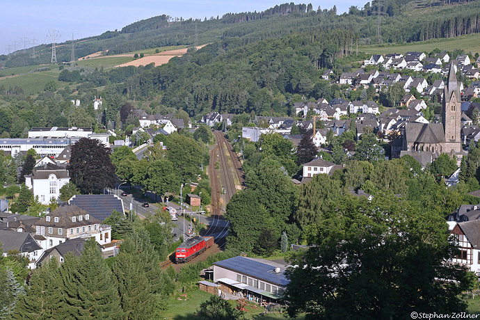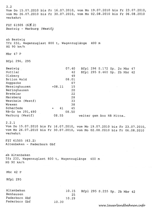Während einer Gleisauswechselung zwischen Fröndenberg und Neheim-Hüsten wurde zwischen dem 15.07. und dem 06.08.2010 der Güterverkehr für die Tarifpunkte Neheim-Hüsten und Egger über Warburg abgewickelt. Für dreieinhalb Wochen planmäßig mit der BR 232 bespannt ist der Zug am 20.07. mit einem E-Wagen Schrott aus Hüsten Ost am östlichen Nuttlarer Bahnübergang auf dem Weg nach Paderborn. Die Produktion der Fa. Perstorp (ex Degussa) ruhte in diesem Zeitraum.