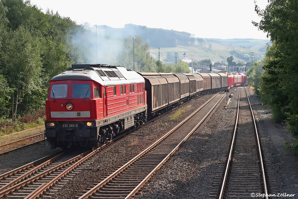 Leider verkehrte der bestausgelastete Umleiterzug im Sommer 2010 am Nachmittag bei totalem Gegenlicht. Auf ein Bild des FZT 61507 nach Hagen-Vorhalle mit 232 280 sollte aber trotzdem nicht verzichtet werden, aufgenommen bei der Ausfahrt aus dem Startbahnhof Bestwig.