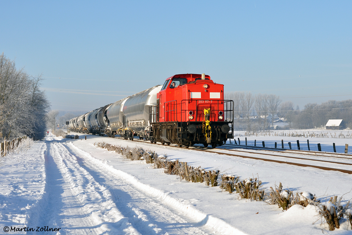 "Zwischen den Jahren" ist die Stammlok 212 007 der DGEG für die letzten Meile des HLVE-Braunkohlestaubzuges zwischen Schwerte und Horlecke anderweitig beschäftigt, sodass Dienstleister Railflex sich am 30. Dezember 2010 von Alstom 203 117 für diesen Dienst organisiert hat. Bei herrlichem, aber eiskalten Winterwetter kommt der knallrote Brummer auf das Einfahrtsignal Langschede zugefahren.