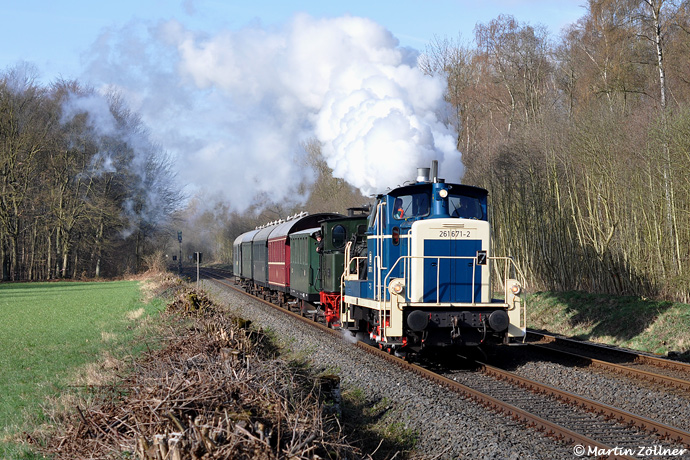 Am 01. April 2012 sind 261 671 des Lokdienstes A.Voll und die Dampflok Waldbröl der IG Bw Dieringhausen e.V. neben der ehemaligen Rangierbahnhofsfläche von Geisecke zum 100-jährigen Streckenjubiläum der Hönnetalbahn unterwegs. Die Dampflok aus dem Wiehltal wird einige Fahrten zwischen Fröndenberg und Binolen absolvieren, während die 261 als Reservelok bis zur abendlichen Rückfahrt in Fröndenberg verweilen wird.