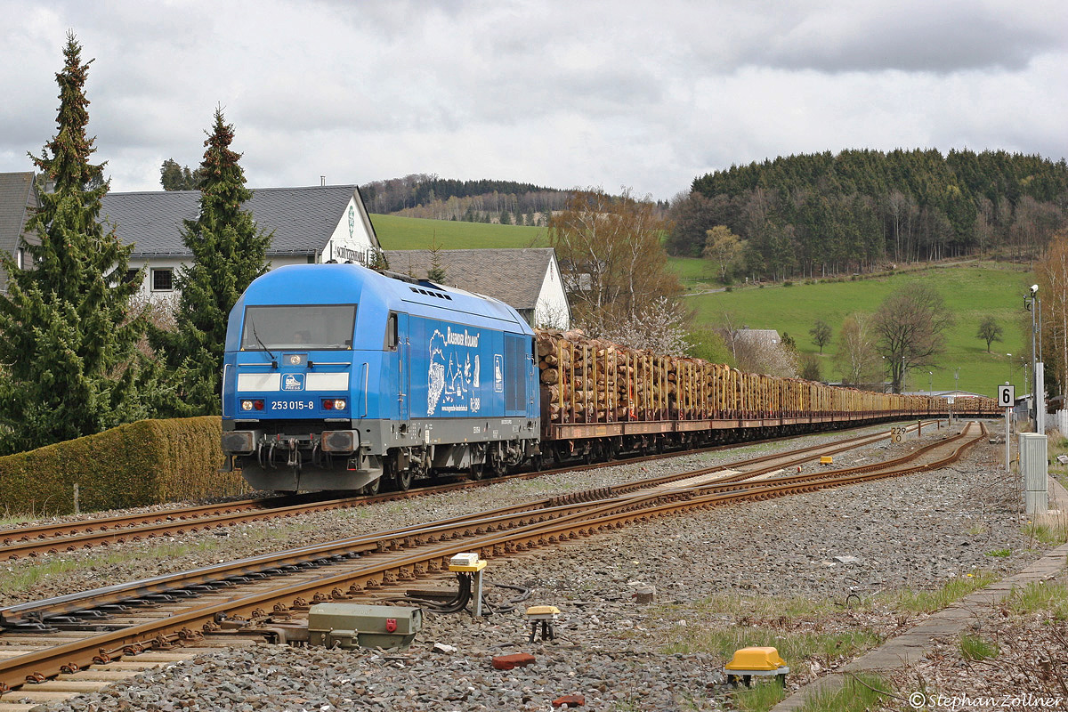 Nach monatelanger Abstinenz gab es am 26.04.2012 mittags mal wieder einen in Brilon Wald beladenen Holzzug, der den Weg zum Zellstoffwerk in Niedergörne durch das Ruhrtal abwärts nahm. Im Blockabstand zum vom Lichtbildner gefahrenen RE 3910 konnte auf dem Feierabend-Nachhauseweg noch schnell diese Aufnahme des PRESS-Eurorunners 253 015 an der "Nuttlarer Standardfotostelle" angefertigt werden.