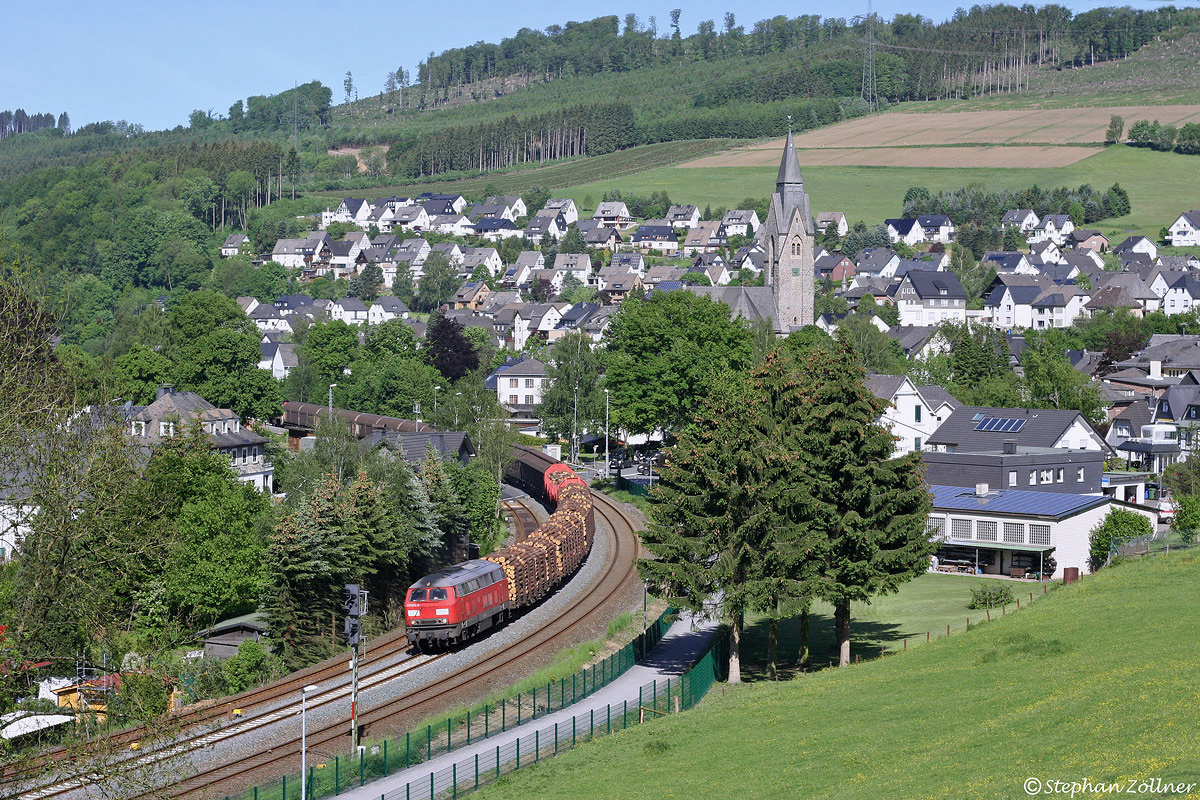 Am Freitag, dem 25. Mai 2012 sollte zum Abschluss der einwöchigen, lastaufkommensbedingten Einsätze der Baureihe 225 vor dem Eggerzug noch eine Aufnahme im Heimatdorf vom Nuttlarer Dümelskopf aus gemacht werden. Das hatten sich auch schon zwei andere Fotografen gedacht und so wanderte wiederum 225 024 bei strahlendem Sonnenschein auf die Chips dreier Kameras. Leider hielten es die auf der Wiese befindlichen Pferde nicht für nötig, im passenden Augenblick mal vorbeizuschauen.