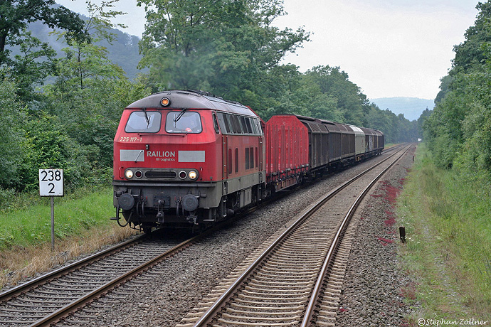 Am 20. Juli 2012 war die Sechszehnzylinder-225 117 vor der Eggerbedienung von Schwerte nach Brilon eingeteilt. Die letzten Nebelschwaden im Ruhrtal verziehen sich gerade, als es bei Elleringhausen zur Begegnung mit RE 10962 nach Dortmund kommt.