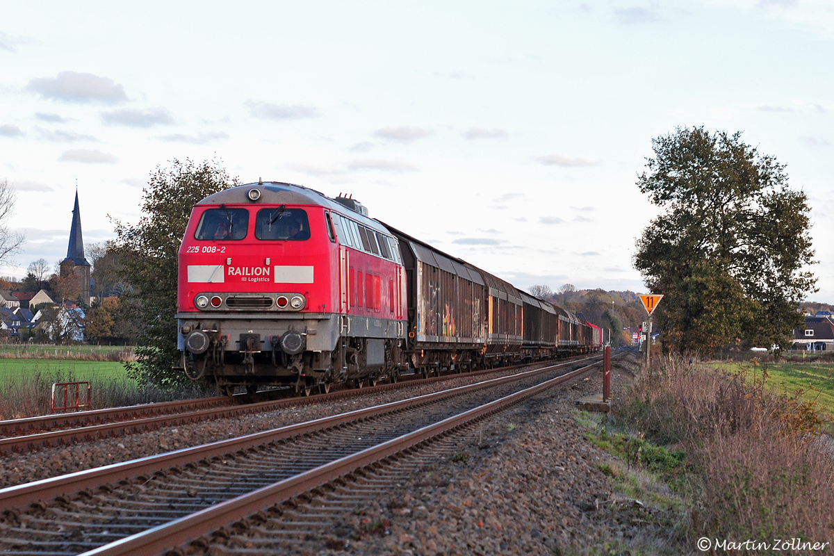 Mit der Wagenausgangsfuhre EK 54404 vom Briloner Eggerwerk am Zughaken kommt die mit dem MTU-Versuchsmotor 12 V MTU 4000 R 84 ausgrüstete 225 008 bei Altendorf des Weges. Auch die berühmte Fotowolke war passend zur Stelle und ließ nur eine Sparbeleuchtung der Szenerie zu. Der 09. November 2012 war der letzte bekannte Einsatztag der Maschine vor ihrer Verlägerungsuntersuchung im Werk Vorhalle.