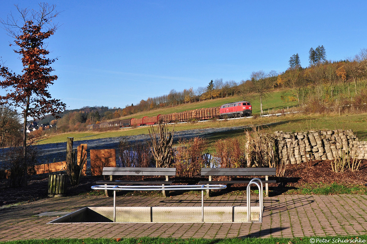 Traumhaftes Novemberwetter herrschte am 14.11.2012, als die Eggerbedienung letztmalig mit der Baureihe 225 gefahren wurde. Das ließ sich auch Peter Schierschke nicht entgehen und so fertigte er diese Aufnahme am bereits winterfest gemachten Tretbecken an der Olsberger Helbeke an.