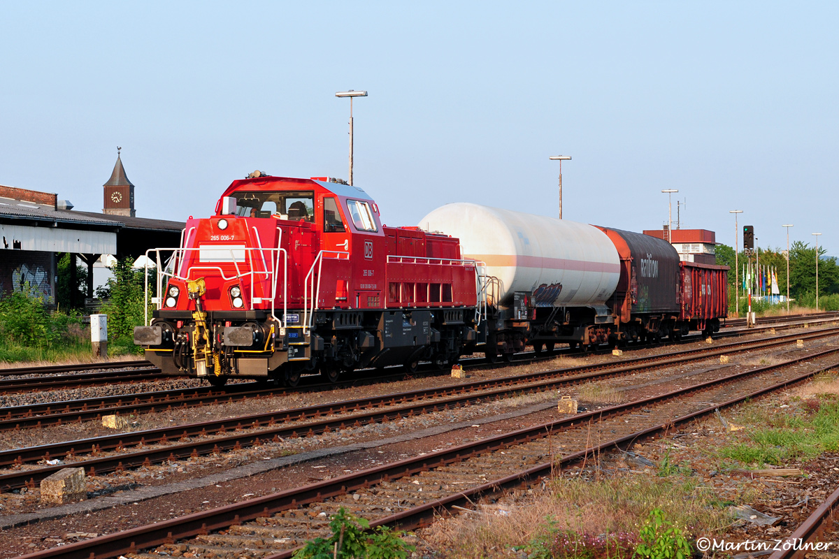 Zum 17. Juni 2013 wurde die Traktion der abendlichen Wagenabholung von Neheim-Hüsten nach Schwerte auf die neuen Maschinen der Gravita-Bauart 15L BB umgestellt. In den letzten Sonnenstrahlen des 08. Juli 2013 rollt die Oberhausener 265 006 mit dem kurzen Zug aus der Neheimer Übergabe auf Signal HP 2 Richtung Schwerte am Fotografen vorbei aus dem Bahnhof.