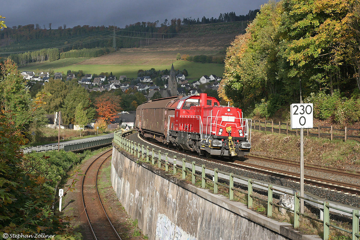 Seit dem Einsatzende der Baureihe 225 Ende Juli 2013 ist es fotomäßig ruhig geworden im Oberen Ruhrtal. Das tägliche Triebwageneinerlei reizt nicht wirklich an die Strecke zu gehen, einzig die neue BR 265 sollte noch im Neuzustand dokumentiert werden. Am 15. Oktober konnte 265 015 mit dem Eggerzug unter perfekter Theaterbeleuchtung am Nuttlarer Dümel oberhalb der Winterberger Strecke bildlich festgehalten werden, keine Minute später hatte sich die Sonne für diesen Tag verabschiedet.