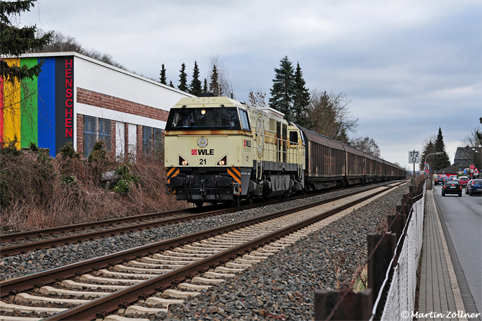 Am grauen 22. Februar 2014 bringt die Fassade der Firma Henschen in Fröndenberg etwas Farbe ins Spiel, als die "Bierkiste" WLE 21 kurz vor Mittag an der Bismarkstraße mit dem samstäglichen Spanplattenzug von Egger nach Lippstadt vorbeizieht.