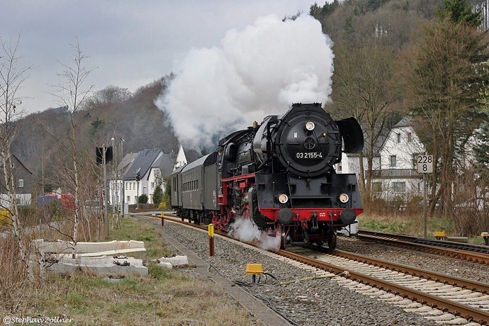 Die seit 2012 wieder betriebsfähige, kohlegefeuerte 03 2155 (ex DRG 03 155, Borsig 1934 ⁄ 14476) der Wedler & Franz GbR hat Anfang März 2014 einige Sonderfahrten in der Eifel absolviert und nutzt zur Rückkehr in östliche Gefilde am 26. März auch die Obere Ruhrtalbahn. An der Abzweigstelle Nuttlar erinnert die Schnellzugdampflok noch einmal kurz an die im September 1966 eingestellten Einsätze der westdeutschen, kohlestaubgefeuerten Hagen-Eckeseyer 03.10 .