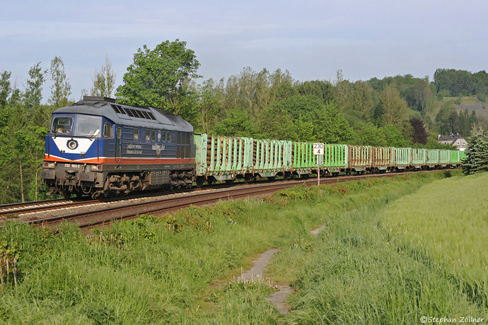 Für den 20. Mai 2014 war beim Eggerwerk ein Ganzzug mit Rundholz aus Medewitz (Fläming) angekündigt. Anscheinend war die Raildox 232 103 aber mit der alleinigen Traktion (ursprünglich Lastvorspann mit Raildox-285 geplant) ein wenig überfordert, denn am Nachmittag blieb der Zug trotz Teilung in Bestwig bei Elleringhausen liegen. Nach dem Zurücksetzen dorthin wurde dann in drei Teilen gefahren, wobei die letzten Wagen erst am Morgen des Folgetages zur Zustellung kamen, hier am Nuttlarer Dümel.