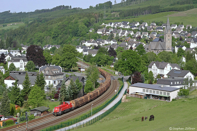 Anfang des Jahres 2014 wurden fürs Bahnmotiv störende Fichten am Nuttlarer Abzweig gefällt, so dass sich die Kurve vom Dümelskopf aus nun besser im Bild umsetzen lässt. Am 25. Mai herrschte perfektes Wetter und sogar die Pferde ließen sich und 265 015 mitsamt Eggerzug "auf die Platte" bannen.