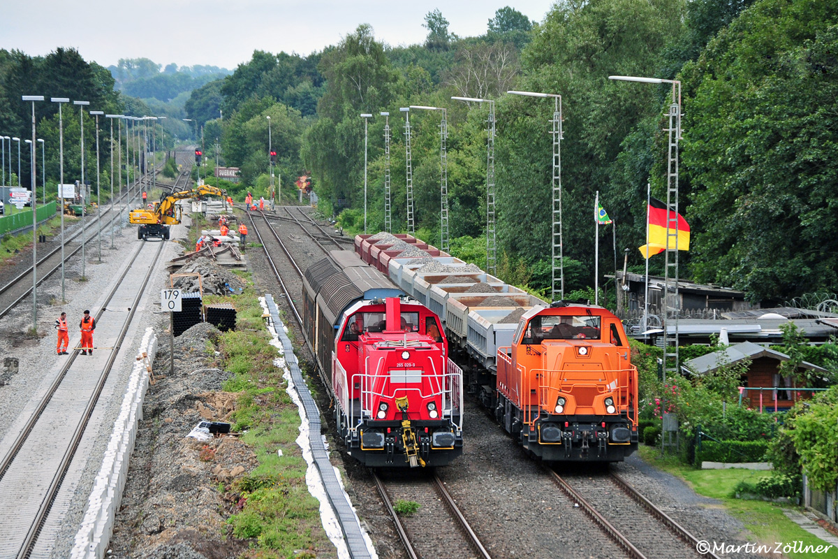 Am 15.08.2014 konnte in der Bahnhofsbaustelle Wickede (Außenbahnsteigherstellung mit Unterführung, Weichenaustausch) das einträchtige Nebeneinander der drittletzt- und drittgebauten Voith-Gravita beobachtet werden. Während die DB Schenker-265 029 links mit dem Eggerzug nach Schwerte aus der Kleinserie der leistungsstärkeren Variante BB 15 L erst Anfang 2014 abgeliefert wurde, entstand die hier rechts als Baulok tätige Northrail-261 302 bereits im Jahre 2010 (EBA-Abnahme erst 2012).