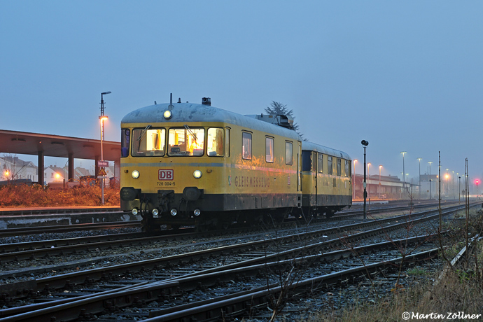 Seit 1974 unermüdlich für die Lagesicherheit der DB-Gleise im Einsatz steht der Gleismeßtriebzug 004 des früheren Gleisbauhofes Opladen am 03. Dezember 2014 im Rahmen einer Meßfahrt noch einmal im DB-Bahnhof der Leuchtenstadt Neheim-Hüsten an der Ruhr zur Abfahrt bereit.